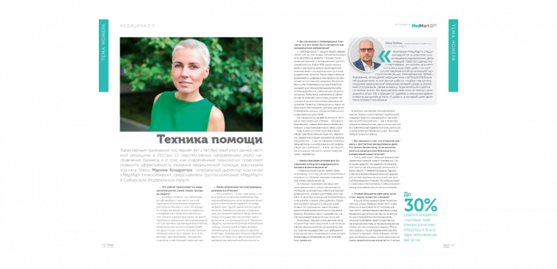 Благодаря личной инициативе и стараниям Марины Кондратюк, журнал Status посвятил медицине один из своих выпусков. Марина является директором представительства нашей компании в Сибирском Федеральном округе. Она с удовольствием поделилась своим мнением по поводу развития современной медицины в нашей стране, рассказала о наиболее перспективных её направлениях, о том, куда можно и нужно ли вообще вкладывать деньги потенциальным инвесторам. Проект «Медицина 2.0» раскрывает взаимосвязь между качеством оказания медицинских услуг и использованием прогрессивных технологических решений. Современное оборудование способно не только эффективно лечить людей, но приносить доход его владельцам.