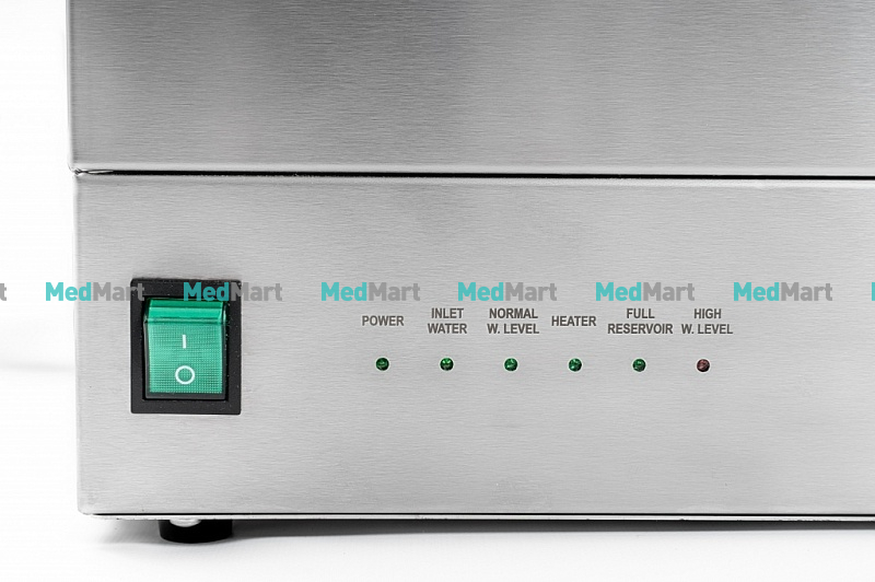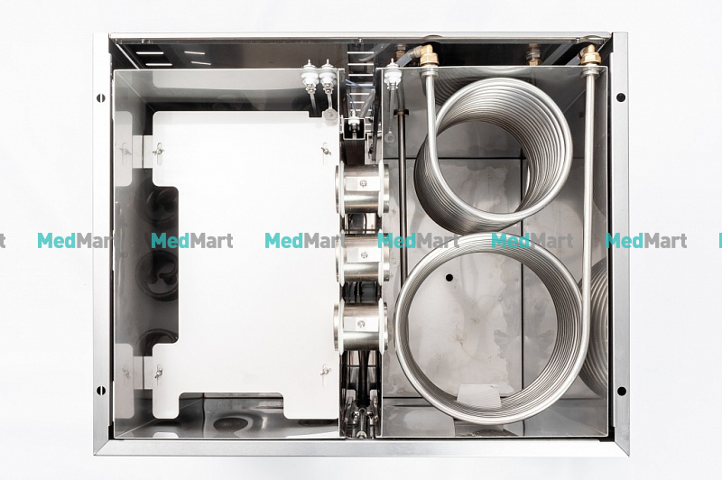 • Система управления. Дистиллятор для воды работает в режиме авто. Отключает подачу электричества и воды, если заполнен сборник для дистиллята. В рабочий режим выходит также в режиме авто. Для этого медперсоналу требуется провести забор дистиллята из сборника аквадистиллятора, освободив место в резервуаре. Переливы исключены, благодаря электромагнитному клапану. Он открывается при достаточном месте в испарительной камере.