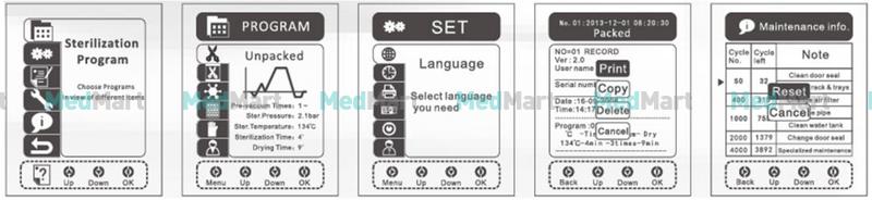 • Работа с данными. Всю информацию о сеансах стерилизации не просто можно отлеживать, но также сохранять на внутренней карте памяти, переносить на ПК через разъём USB, распечатывать на принтере.
