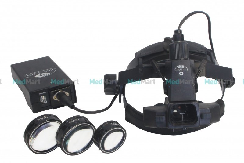 Офтальмоскоп бинокулярный с налобным креплением в виде обруча применяется для расширения зрачка без привлечения медикаментозных препаратов. Это часто требуется как при диагностировании, так и при хирургических мероприятиях. Работает от 5-ти аккумуляторных батарей.