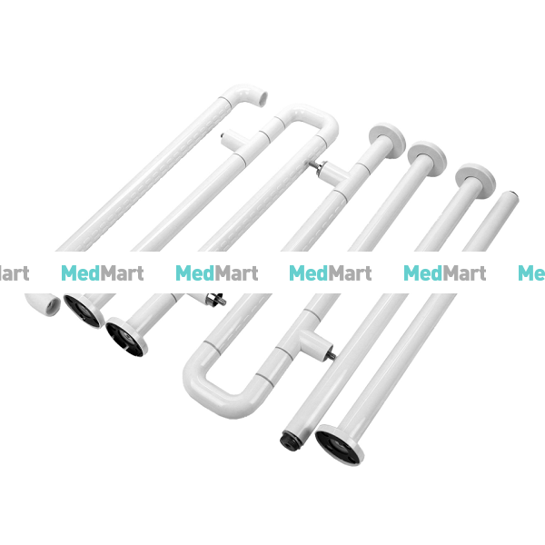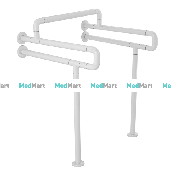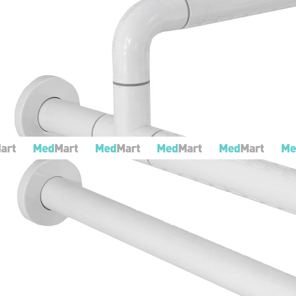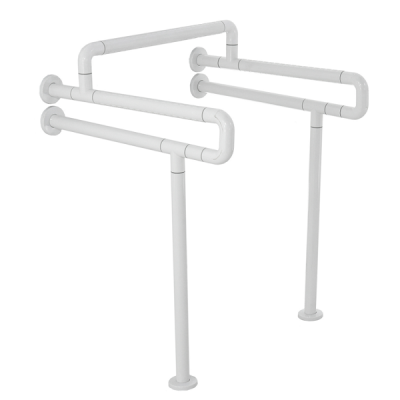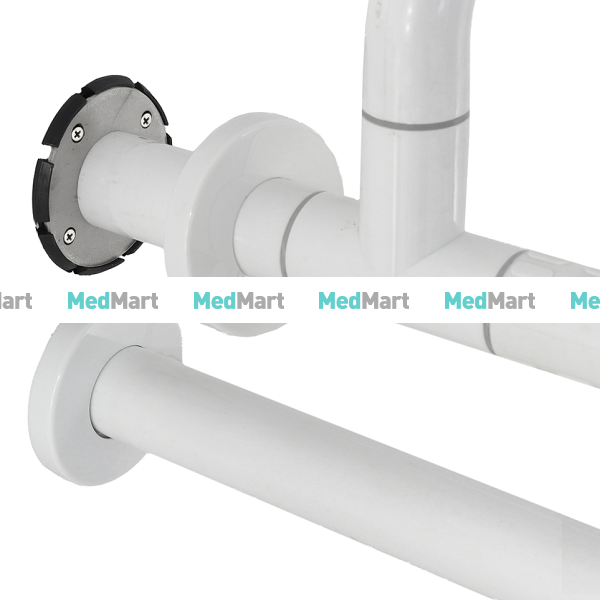 • Повышенная жесткость. Модель состоит из двух отдельно стоящих опор для каждой руки. Поперечная перекладина выполняет роль горизонтального поручня, не позволяя стойкам разъезжаться под нагрузкой. Монтажные фланцы закрываются декоративными заглушками. Несъемные пластиковые накладки не прокручиваются, не трескаются в процессе эксплуатации.