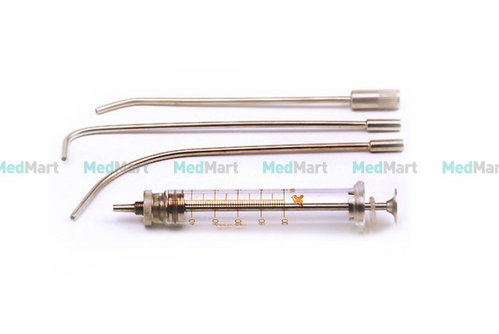 Шприц для промывания миндалин поставляется в комплекте со сменными металлическими трубками различной конфигурации и размера (с прямым, тупым концом и изогнутым по радиусу). Используется инструмент совместно с одноразовыми канюлями. Размер наконечника выбирается в зависимости от размеров лакун, важно избежать повреждения миндалин в период санации.