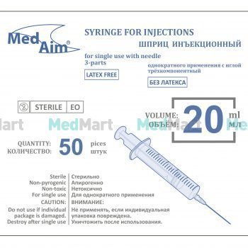 MedAim, шприц 20 мл, 3-х комп., игла 0,8*40мм 21GХ1/2" инъекционный MedAim, шприц 20 мл, 3-х комп., игла 0,8*40мм 21GХ1/2" инъекционный