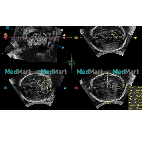 • Расширенное ПО. Набора базовых модулей в ультразвуковой установке достаточно для охвата обширного спектра услуг диагностического центра, комплекса планирования семьи. Предусмотрена разработчиком и система перепрограммирования. В стандартное предустановленное программное обеспечение входят: тканевой доплер, режим многолучевого сканера CRI, панорамное изображение XTD View, визуализация кровотока. Режим FFC отвечает за многофокусную обработку сигнала при ультразвуковом сканировании. SRI - за подавление артефактов и шумов. С помощью SonoIT и SonoNT в режиме авто рассчитывают толщину четвертого желудочка и воротниковой зоны плода соответственно. Для вычисления фетобиометрических показателей по упрощенной схеме предусмотрен режим SonoBiometry. Границы лица и тела четко очерчиваются на мониторе ультразвукового аппарата при формировании изображений и на фото, видео при переносе информации на сторонние носители. За эту функцию программного обеспечения отвечает режим 3D SonoRenderLive. Число помех при формировании объемной картинки сведено к минимуму.
